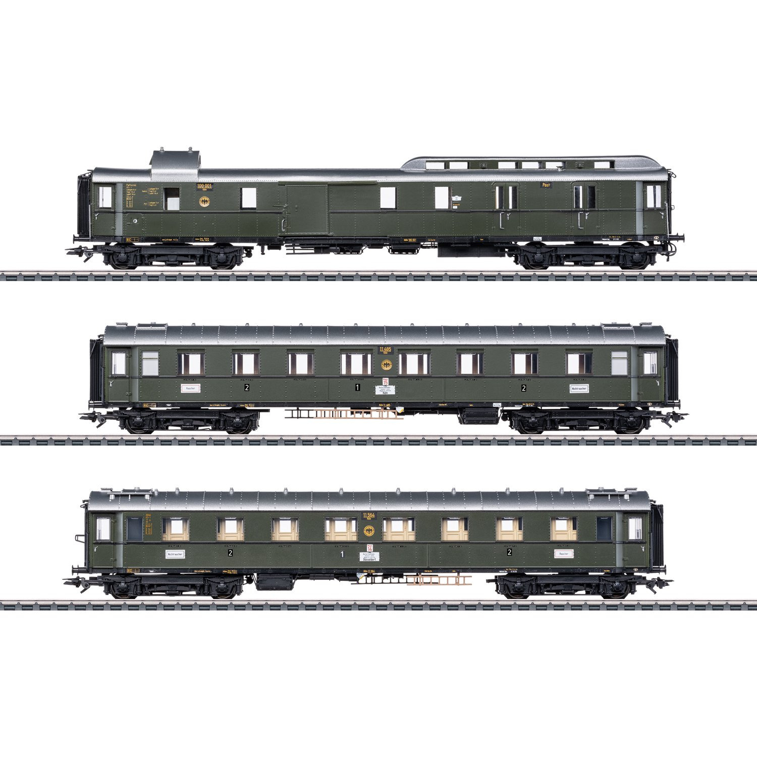 Modell: Detaillierte Ausführung in vollem Längenmaßstab. Befahrbarer Mindestradius 360 mm. Drehgestelle der Bauart Görlitz II schwer. Stirnseitig separat angesetzte Aufstiegsleitern und angesetzte Griffstangen. Reisezugwagen mit mehrfarbiger Inneneinrichtung. Alle Wagen mit serienmässig eingebauter LED-Innenbeleuchtung, mit warmweissen Leuchtdioden (LED) und Pufferkondensator. Ein Schnellzugwagen 1./2. Klasse mit Schleifer zur Stromaufnahme, versorgt über die serienmässig eingebauten stromführenden Kurzkupplungsköpfe den ganzen Wagenverband mit Strom. Dazu ist eine fest definierte Fahrzeugreihenfolge vorgegeben. An beiden Enden des Wagenverbandes sind die normalen neuen Kurzkupplungsköpfe für niedrigere Pufferhöhen eingesetzt. Pufferhöhe bei allen Wagen nach NEM. Gesamtlänge über Puffer ca. 76,2 cm.