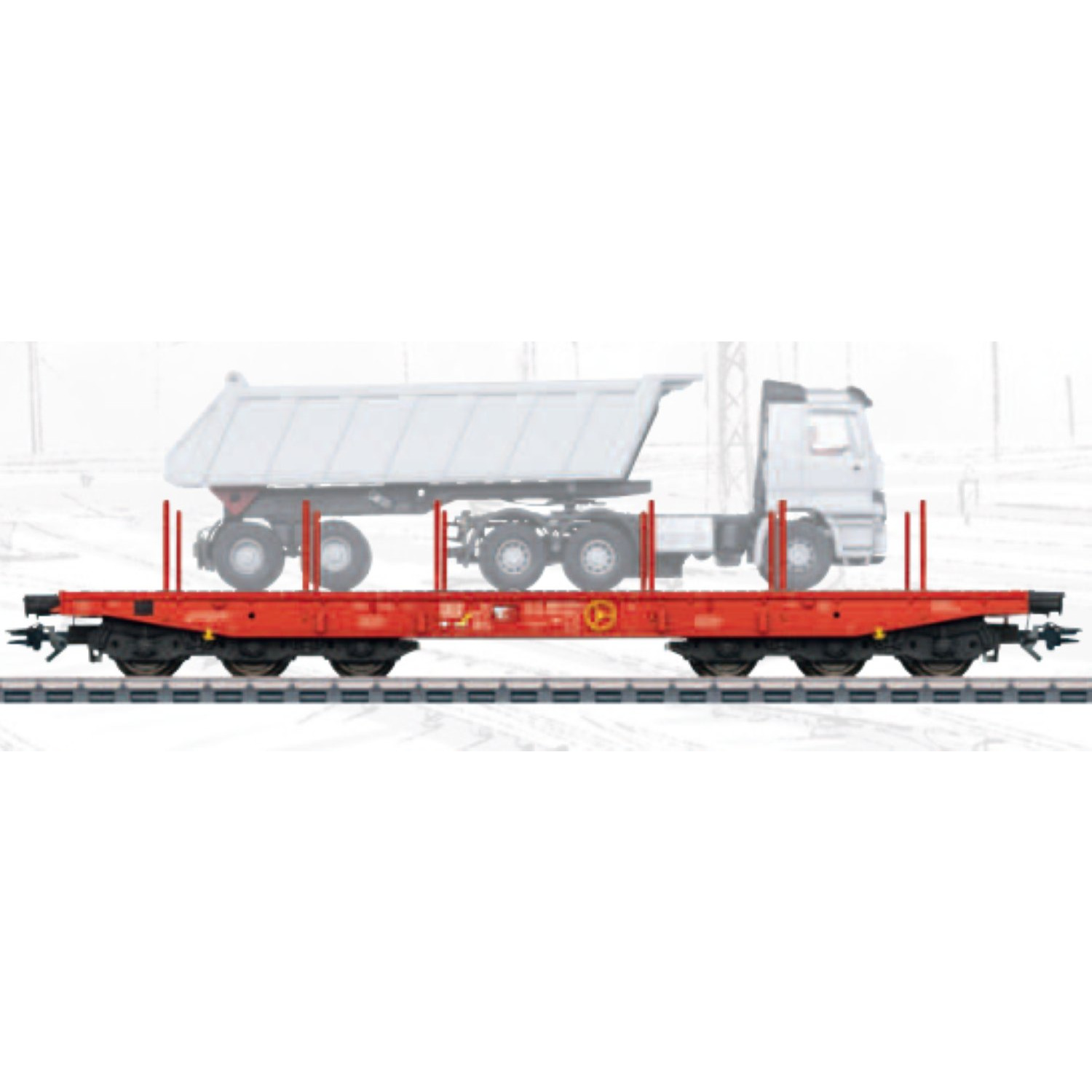 Vorbild: Sechsachsiger Schwerlastwagen Bauart Samms 710 der Deutschen Bahn AG. Verkehrsrote Grundfarbgebung. Betriebszustand ab 2021.