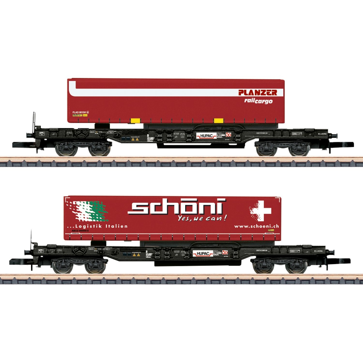 Modell: Fahrwerk der Taschenwagen jeweils aus Metall. Wagen jeweils beladen mit einem Sattelauflieger "Planzer" und "Schöni". Feine Farbgebung und Beschriftung. Wagen mit unterschiedlichen Nummern. Eingebaute Kurzkupplungshaken. Gesamtlänge über Puffer 156 mm.