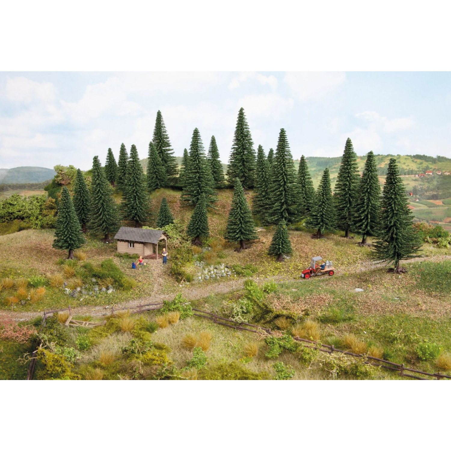 Tannen wie im Schwarzwald! Die preiswerten Hobby-Bäume von NOCH sind ideal, um auf Ihrer Anlage richtig aufzuforsten. Die Modelltannen sind die perfekte Lösung, um für wenig Geld für dichte Wälder und natürlich wirkende Baumgruppen zu erschaffen. Die Bäume sind in verschiedenen Höhen verfügbar. Je nach dem wie viele Bäume Sie benötigen gibt es die Modellbäume in den Verpackungsgrößen 50, 25, 10 oder auch nur 5 Stück.