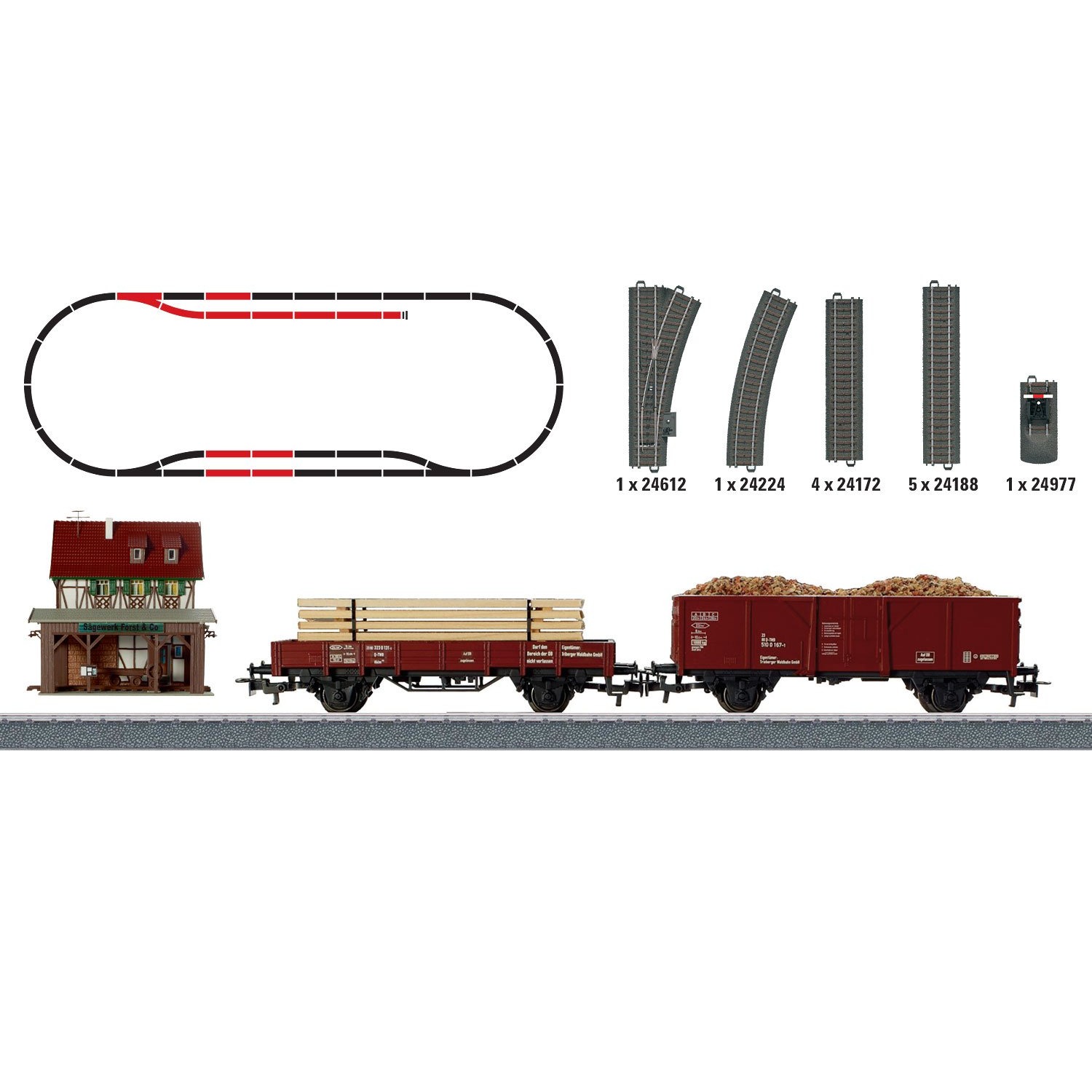 Niederbordwagen mit Schnittholz beladen. Offener Güterwagen mit Ladungseinsatz "Sägespäne". Alle Wagen mit Relex-Kupplungen. Länge der Güterwagen-Garnitur 23,0 cm.