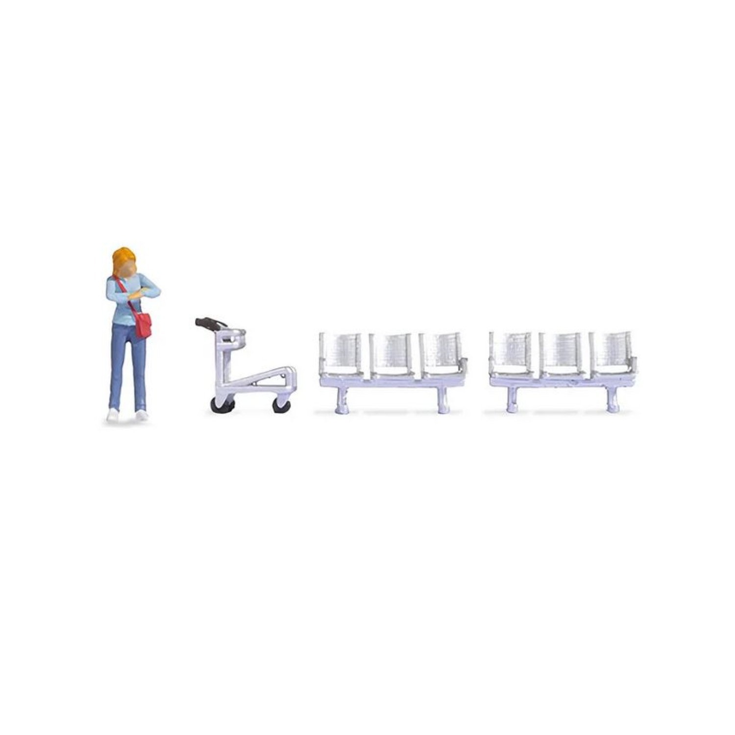 In dieser Szene schaut eine weibliche Reisende gerade auf Ihre Armbanduhr. Sie trägt ein hellblaues Oberteil und eine dunkelblaue Hose. Zusätzlich hat Sie sich eine rote Tasche umgehängt. Passend dazu erhalten Sie zwei Sitzbänke für Bahnhöfe und einen Gepäckwagen.e