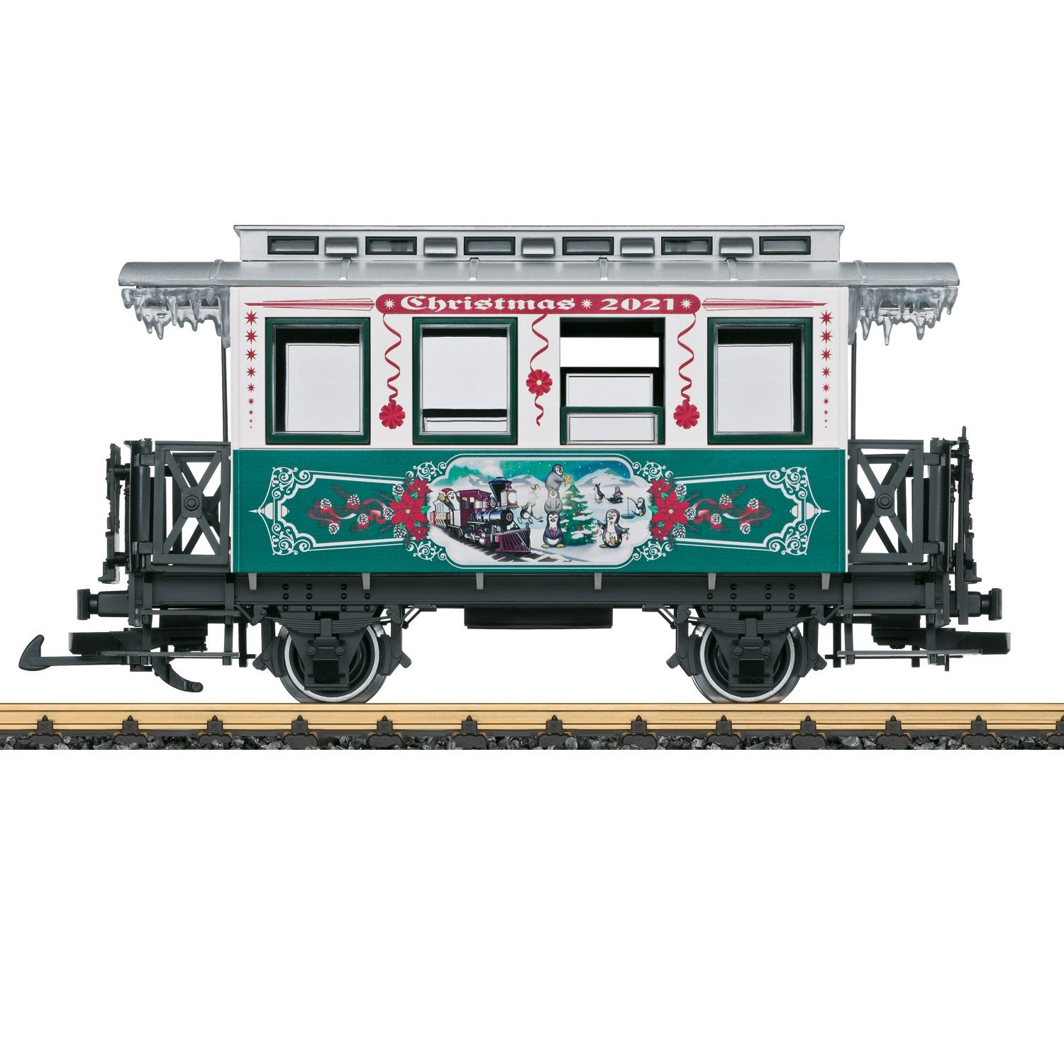 Dieser Weihnachtswagen ist mit einem wunderschönen Motiv aufwendig bedruckt. Das Modell verfügt natürlich auch über Türen zum Öffnen, und ergänzt nahtlos die bisherige Reihe der LGB Weihnachtswagen. Metall-Scheibenradsätze. Länge über Puffer 30 cm.