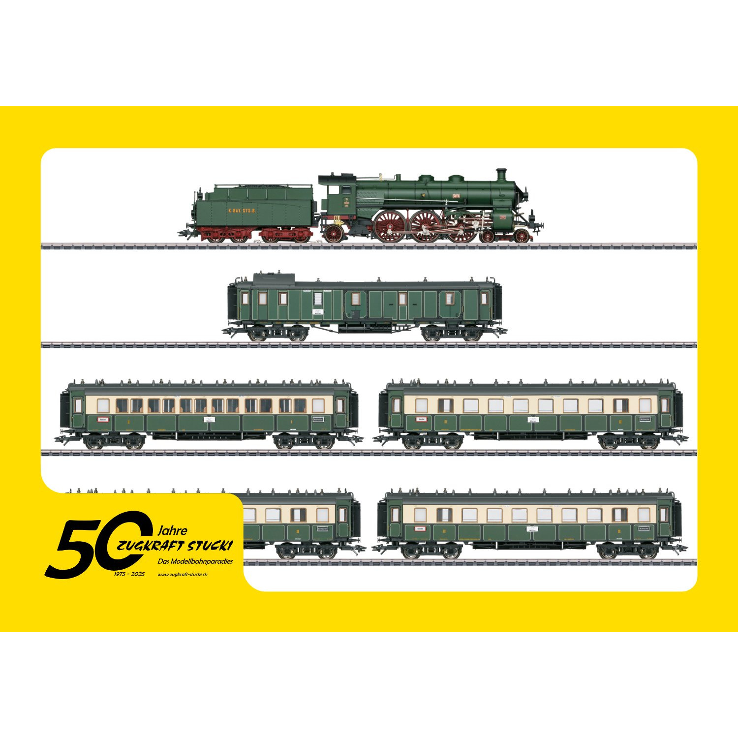 Vorbild: Zugpackung bestehend aus einer Schnellzug-Dampflokomotive der Gattung S 3/6 "die Hochhaxige", drei Schnellzugwagen 3. Klasse CCü, einem Schnellzugwagen 1./2. Klasse ABBü und einem Schnellzug-Gepäckwagen PPü. Zuglauf Stuttgart - Ulm - Augsburg - München. Königlich Bayerische Staatseisenbahn (K.Bay.Sts.B.). Lok-Betriebsnummer 3629. Betriebszustand um 1912. Personenwagen in fiktiver Farbgebung flaschengrün/elfenbein.